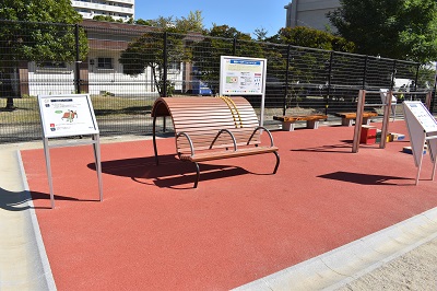 要介護状態になる主な原因とされる、「生活習慣病」「ロコモティブシンドローム」「認知症」に効果的な遊具を設置し、楽しみながら自主的に運動を行うことができる場及び地域の健康づくり・交流の場として整備された公園のことです。平成31年3月に第1号地が梅光園緑道(梅光園2丁目)に、令和3年3月には第2号地が福浜公園(福浜2丁目)に完成しました。