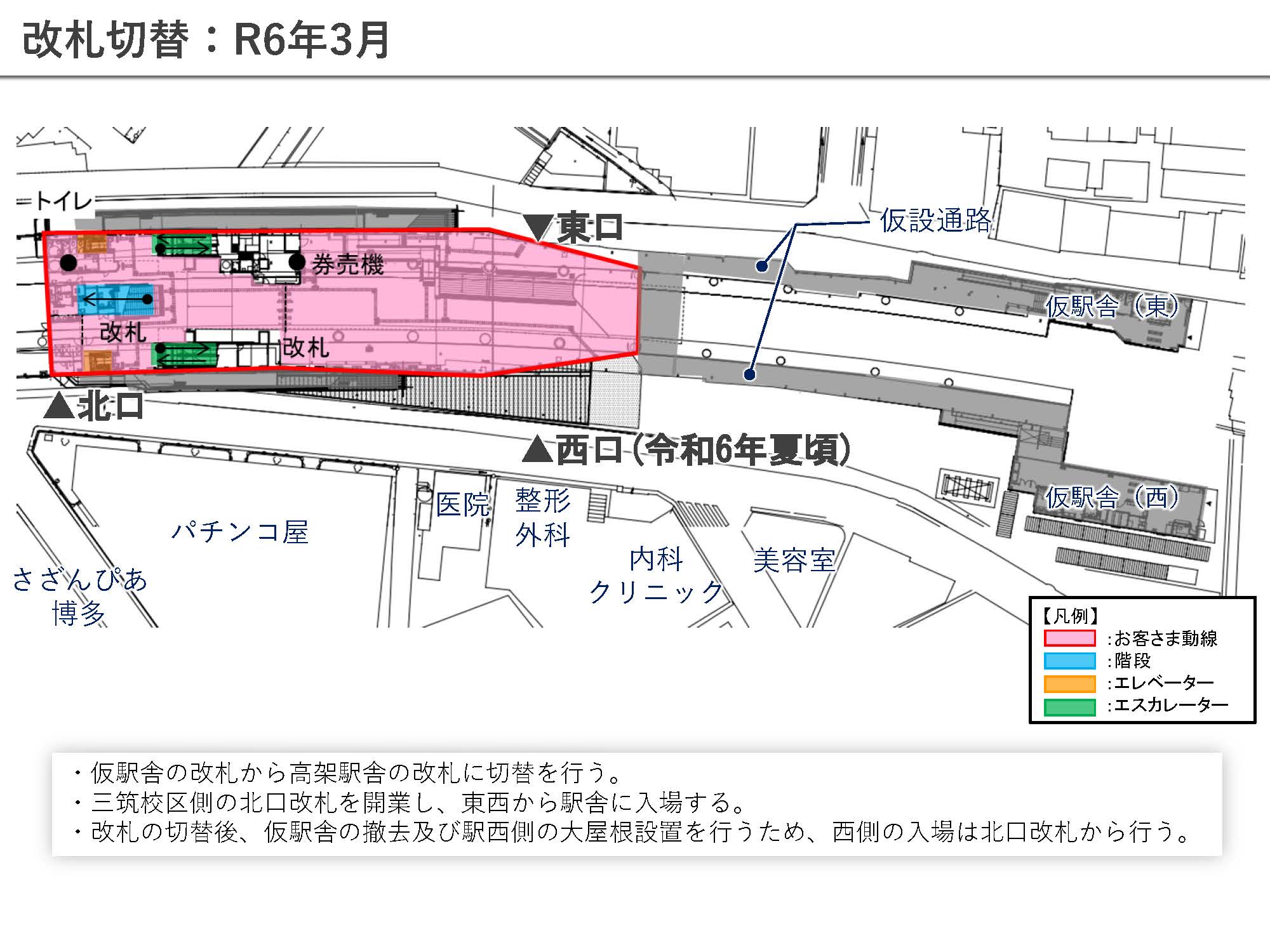 雑餉隈駅においては、北口改札および東口改札をオープンしており、令和6年夏頃の完成(西口オープン)に向けて、工事を行っております。