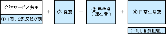 施設(ショートステイを含む)に入所・入院した場合の負担額は,(1)サービス費用の1割・2割又は3割,(2)食費,(3)居住費(滞在費),(4)理美容などの日常生活費等が利用者の負担になります。