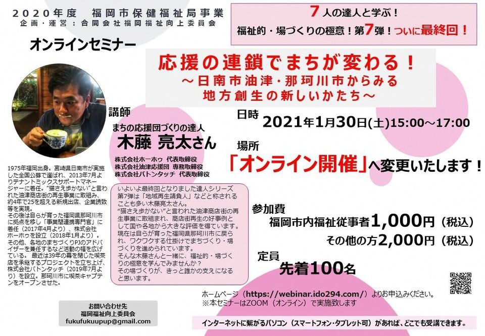 本講座は,福祉従事者向けの場づくり講座です。社会に不安が渦巻く今こそ,福祉従事者の専門性が問われる時代ともいえます。全国のさまざまな業界における著名な場づくりの達人たちに,多面的な切り口から地域や社会の巻き込み方や関わり方,繋がり方を学びます。