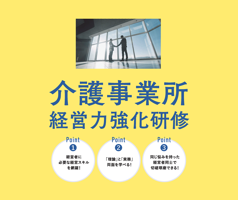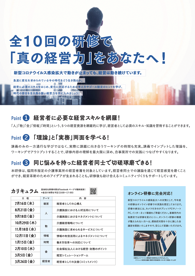- 対象 :福岡市指定介護サービス事業所の経営者(トップマネジメントまたは将来トップマネジメントを担う方)