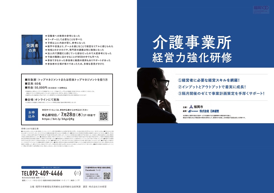 - 対象 :福岡市指定介護サービス事業所の経営者(トップマネジメントまたは将来トップマネジメントを担う方)