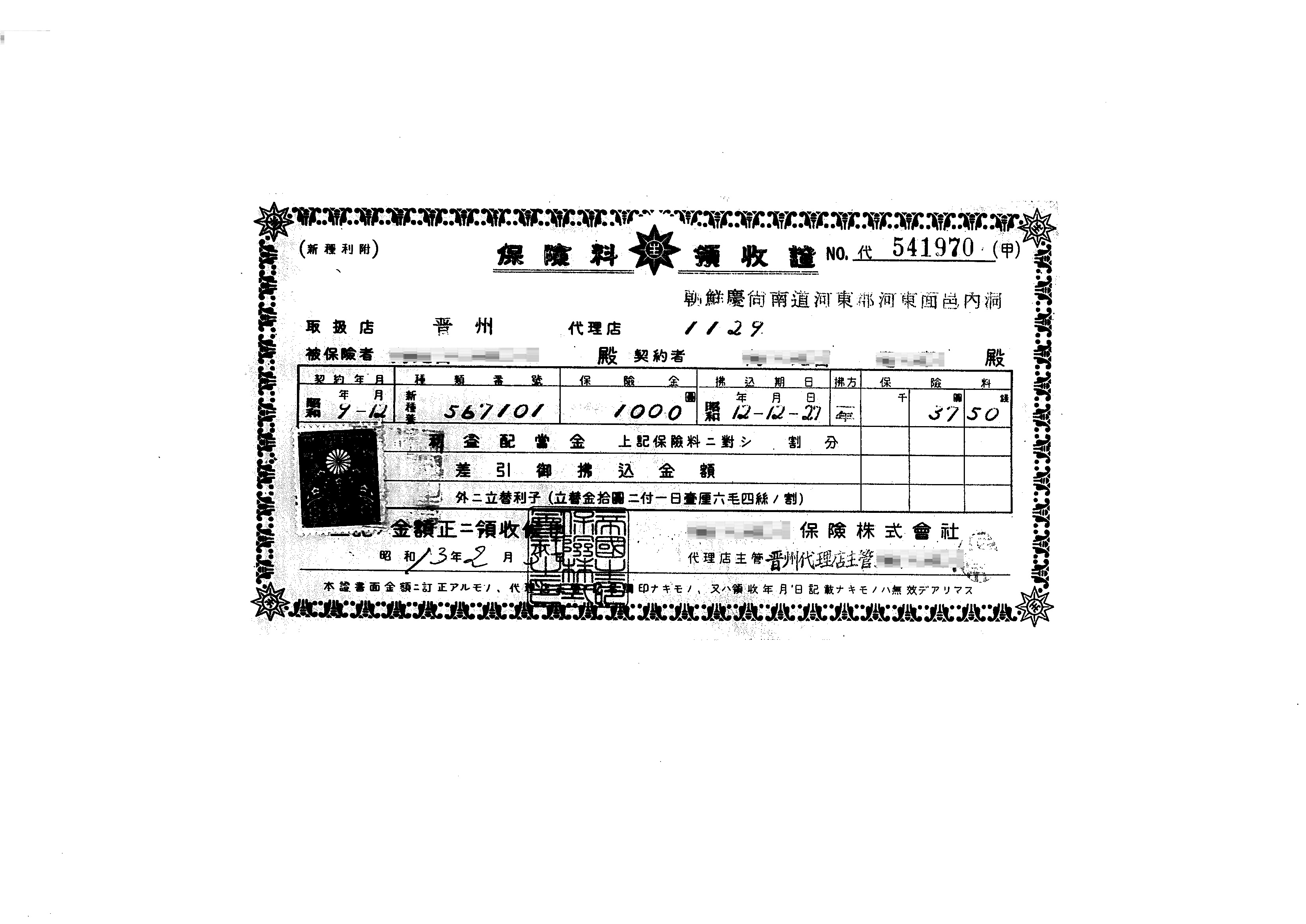 保険領収証<保険料37円50銭>(昭和13年2月3日)