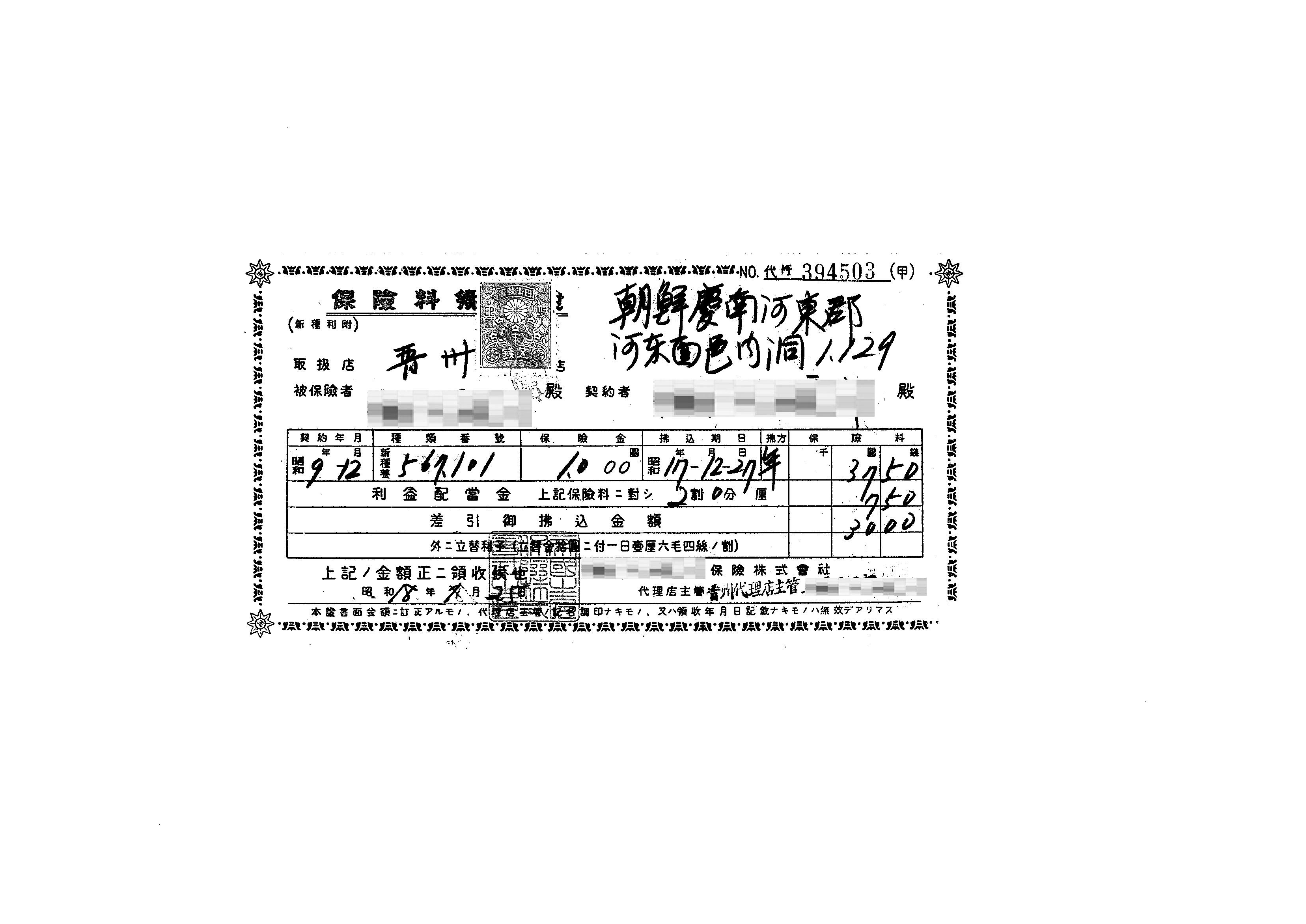 保険料領収証<差引御払込金額30円>(昭和18年1月25日)