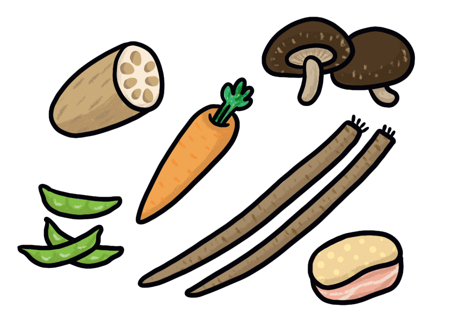 - ごぼう… うす切りにし、ゆでて冷ます。