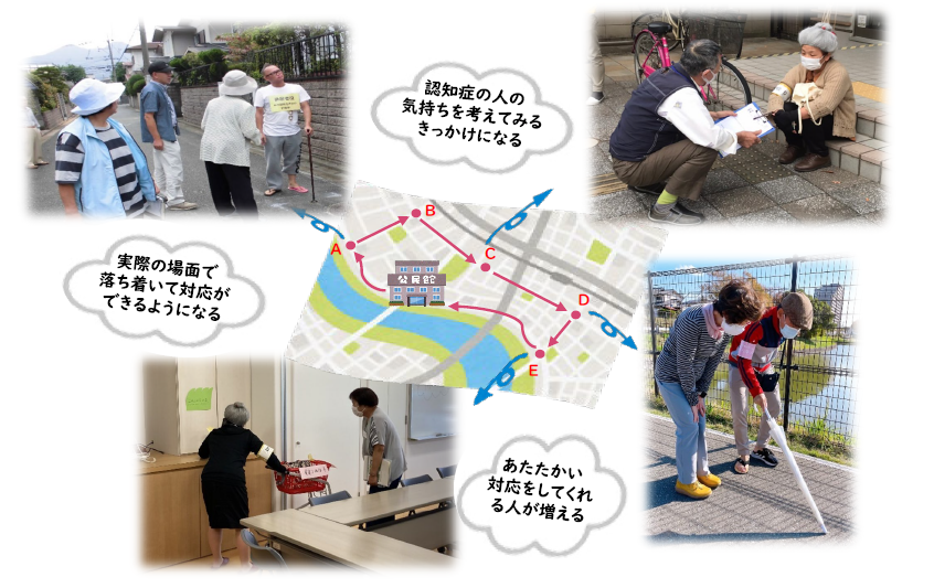 ミニ講話(認知症サポーター養成講座の振り返り、声のかけ方など)の後に、公民館内や校区周辺で様々な認知症役にふんした医療・介護の専門職に実際に声をかける体験をします。