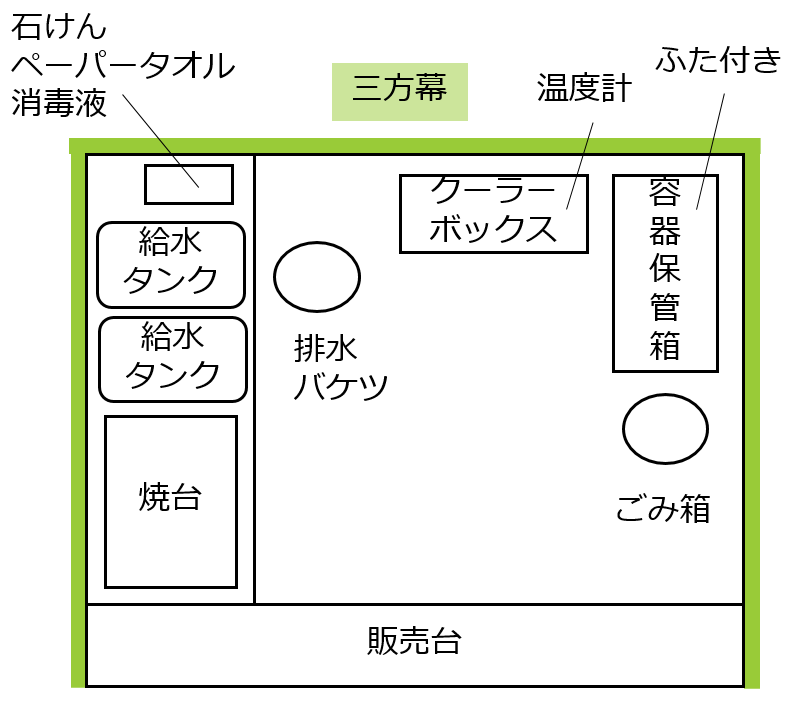 | 仕込場所 | テント内で野菜等原材料の洗浄、カットなどの下処理はできないため、 衛生管理が十分図れる施設において仕込みを行ってください。(許可施設または調理場など設備の整った施設) 前日調理は行わないでください。 |