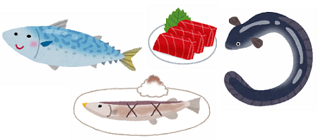 さば、マグロ、さんま、ぶり、うなぎ など