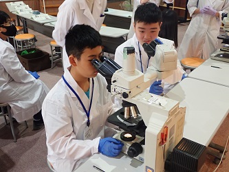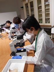 福岡市保健環境研究所(通称ほかんけん)1階にある”まもるーむ福岡”において、身の回りの発酵食品に用いられる微生物について学び、ヨーグルト、パン酵母などの標本を作成し、顕微鏡を使って微生物の形態を観察しました。