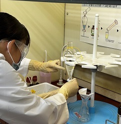 川に油が流れた水質事故が起きたときに、実際に行う分析を体験してもらいました。川に流れた油を分液ロートを使って抽出した後、ガスクロマトグラフで分析を行い、川に流れた油をは何だったのかを推定しました。学校の理科室には無いような器具や分析機器を使って実習を行いました。