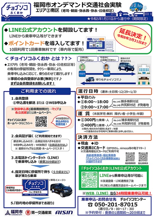 「チョイソコふくおかエリア②南区」は、令和5年1月31日(火曜日)から運行を開始しておりましたが、この度、運行期間を令和7年度末まで延長することが決定しました。