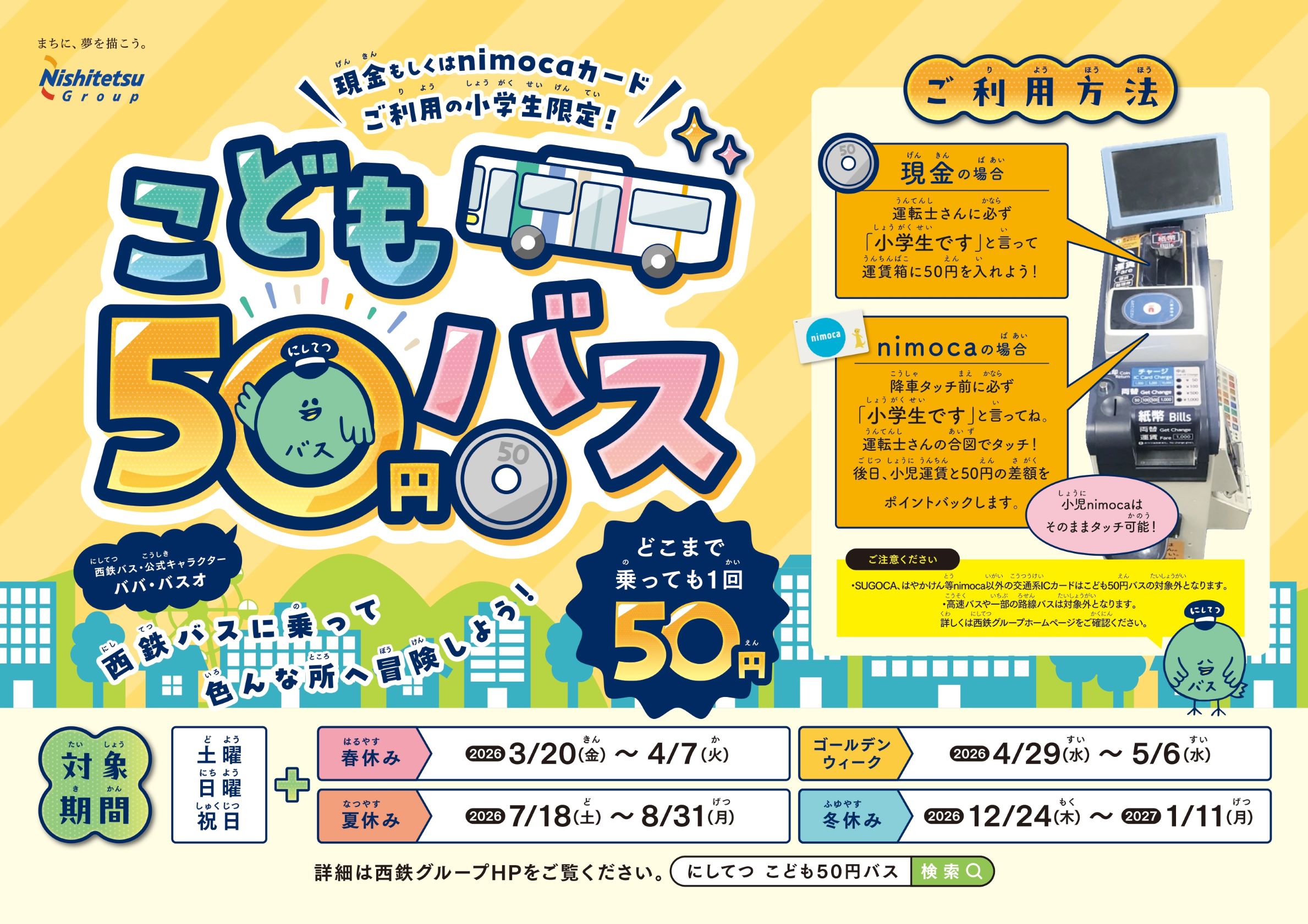 西鉄バスでは小学生以下を対象として、「こども50円バス」を実施しています。実施期間中は、対象の路線バスと特急バスはどこまで乗っても1回50円!西鉄バスに乗って色んな所へ冒険しよう!