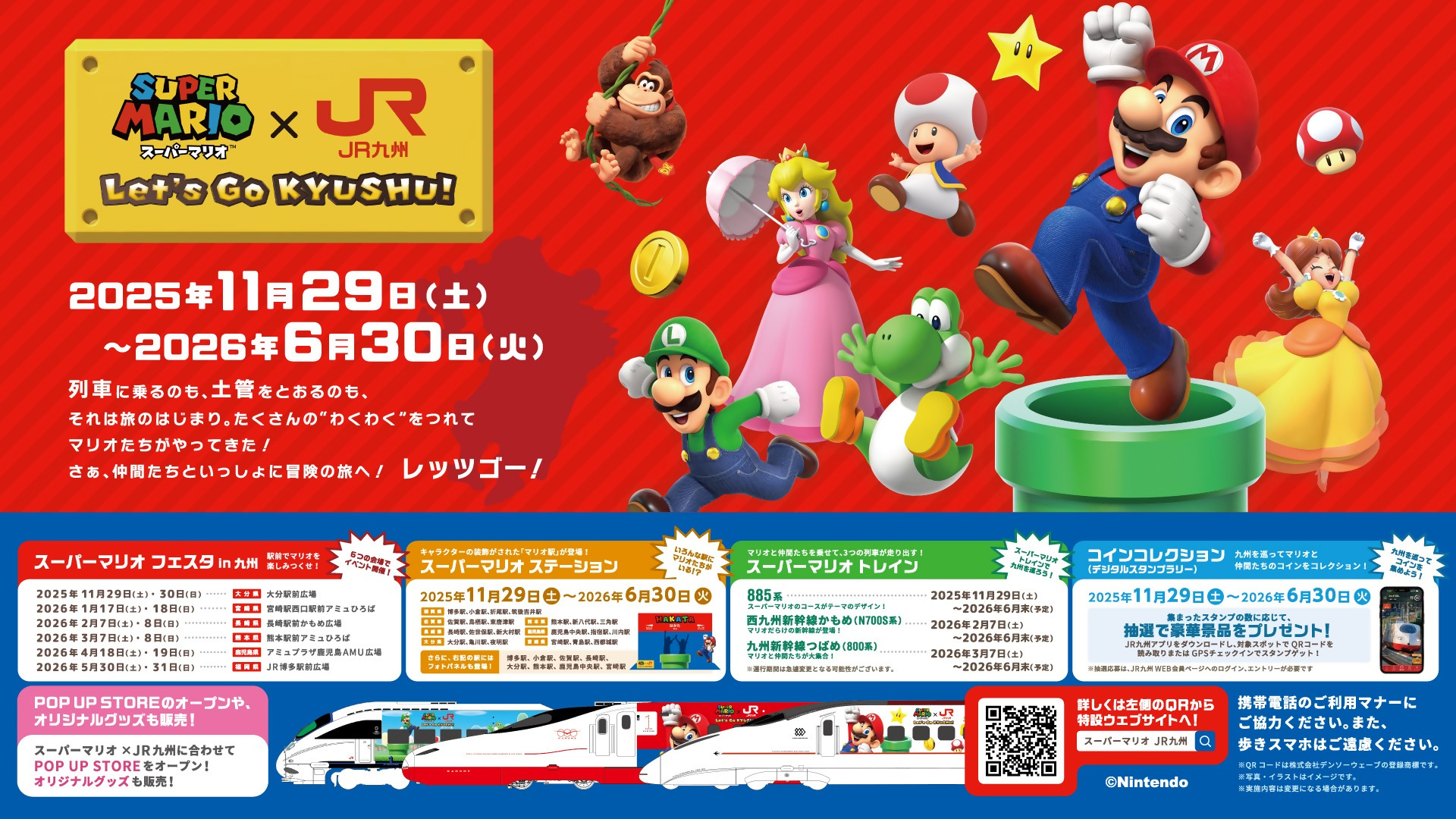 JR九州では、任天堂株式会社が発売する「スーパーマリオ」シリーズとタイアップし、「スーパーマリオ×JR九州 ~Let's GO KYUSHU!~」キャンペーンを実施しています。スーパーマリオの仲間たちと一緒に、九州を旅しませんか。