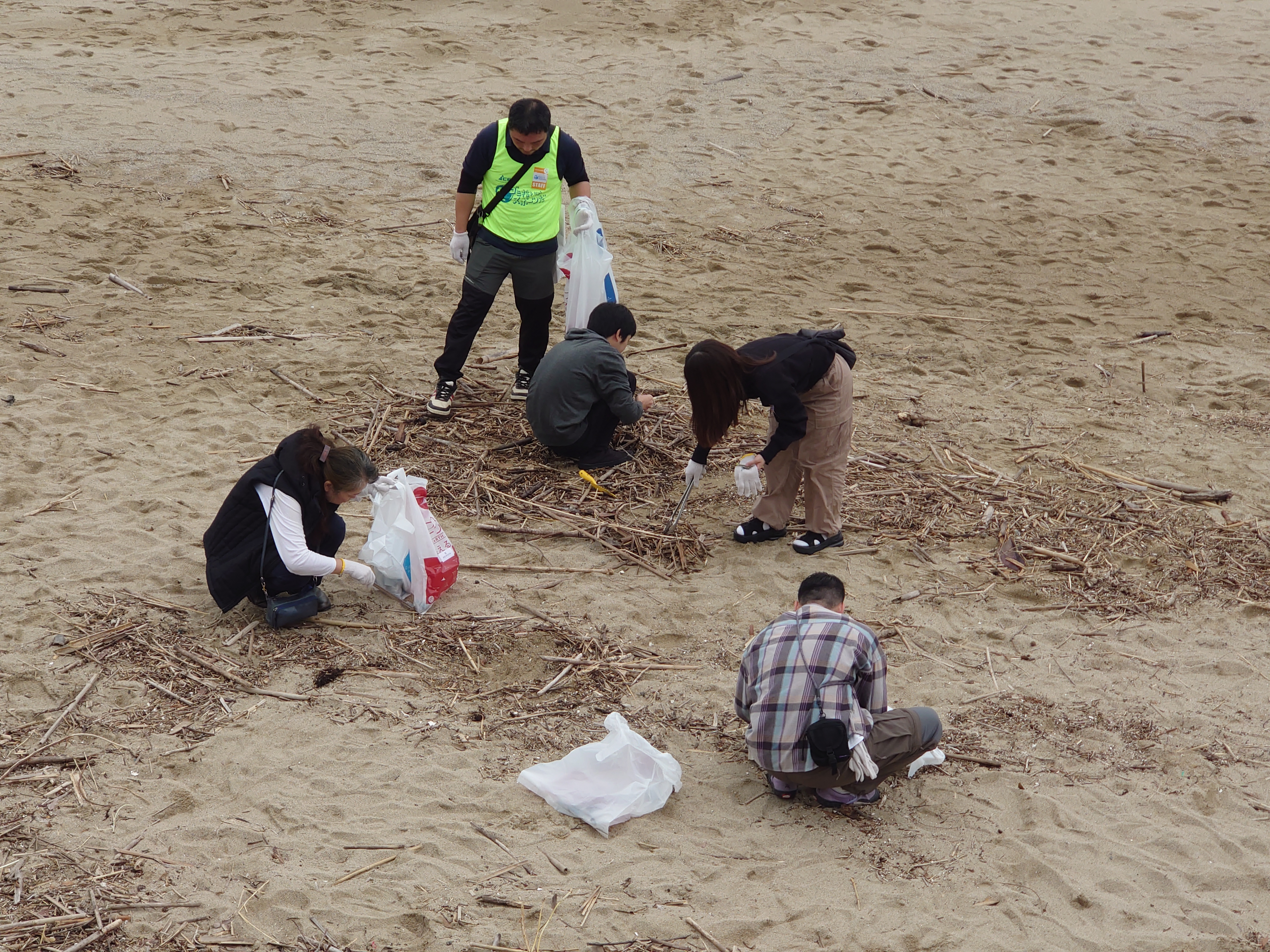冒頭、田中校長先生から「海岸清掃を通して海の環境について自分たちができることを考えよう」との呼掛けの後、当事務局より「海洋プラスチックごみ」について説明を行いました。海岸へ移動すると、海岸には様々なごみが打ち上げられており、太陽の光や波、風により小さくされたマイクロプラスチック(5mm以下のプラスチック)もありました。清掃活動は、1・2年生は海岸入口付近の道路、3・4年生は東側の砂浜、5・6年生は西側の砂浜と3ヵ所に分かれ清掃しました。今回、6年生にはカゴを使ってもらい、海岸のマイクロプラスチックを拾ってもらいました。