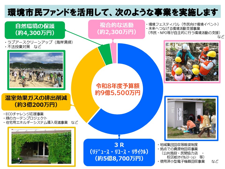 令和8年度予算額:約9億5500万円(内訳)リデュース・リユース・リサイクル:約5億8700万円、温室効果ガスの排出削減:約3億200万円、自然環境の保護:約4300万円、複合的な活動:約2300万円