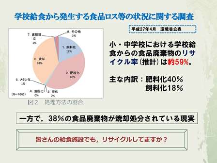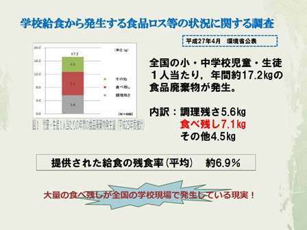給食施設従事者のみなさま,1時間30分の長時間の座学の研修お疲れ様でした。食品ロス削減につきましては,食育活動と連携して進めて行くことが重要事項となっております。みなさまが従事する施設で,「食べ残しの見える化(残食率の掲示)」などで,施設利用者様の食品ロスに対する意識を変えていく取り組みが可能でしたら,ぜひともご協力をお願いします!