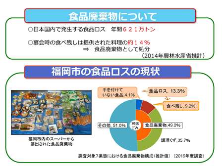 今回は,「福岡市保健福祉局健康医療部健康増進課」の依頼を受け,健康増進課が年5回実施している特定給食施設研修会にて「環境局循環型社会推進部資源循環推進課」と一緒に「食品ロスの現状と対応」についてお話しさせていただきました。