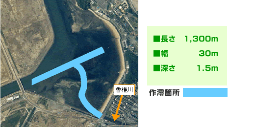 エコパークゾーンの御島海域で、香椎川河口の滞留域を解消し海水交換を促進させるため、平成10年度、平成12年度~平成13年度に合計で全長約1,300m実施しており、御島ゾーンの水質や底質の改善に寄与しています。