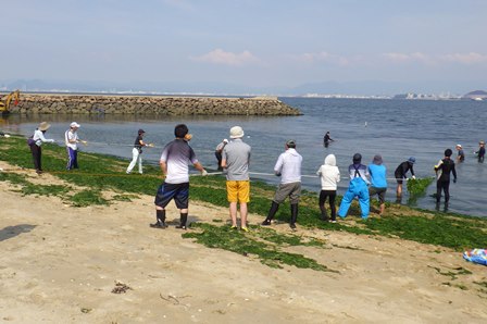 国土交通省国土技術政策総合研究所と連携し,アマモ場の稚仔魚の定量化に向け,地引き網による,アマモ場の生きもの調査を行いました。