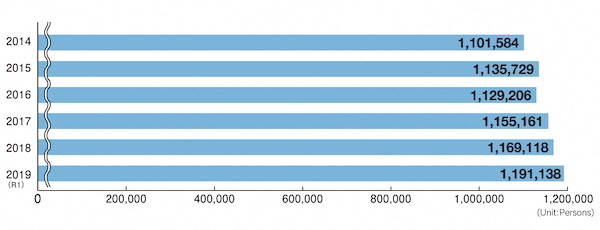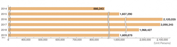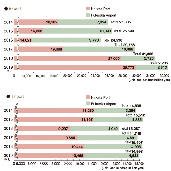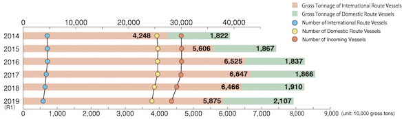 Domestic and foreign vessels calling at Hakata Port in 2019 numbered 28,351 or about 79.82 million gross tons. The freight via the port was about 34.84 million tons (101.7% from the previous year). The number of international seaborne containers was some 960,000TEUs (100.7% from the previous year).