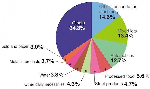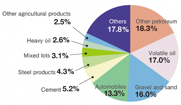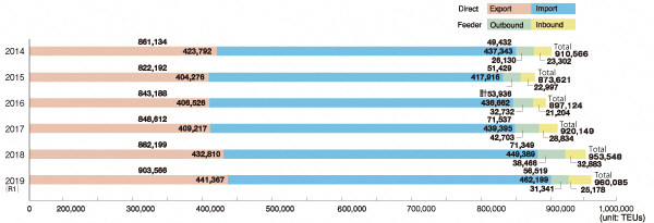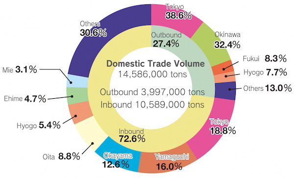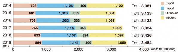 The 2019 domestic trade volume of Hakata Port was 14.5 million tons, of which inbound cargo accounted for 72.6%.
