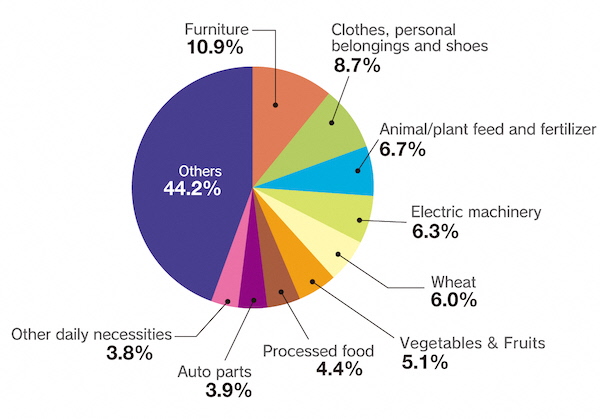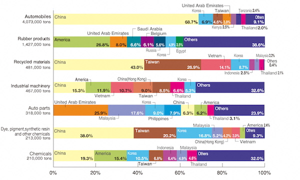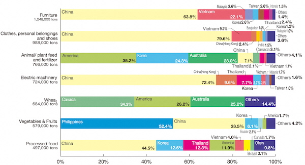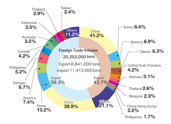 Foreign trade volume in 2019 totaled 20.25 million tons, of which imports accounted for 56.3%. Most imports are daily necessities consumed in neighboring areas. Industrial products such as automobiles and rubber products, and recycled materials accounted for the majority of exports. Main trading partners are East Asian, Southeast Asian and North American countries.