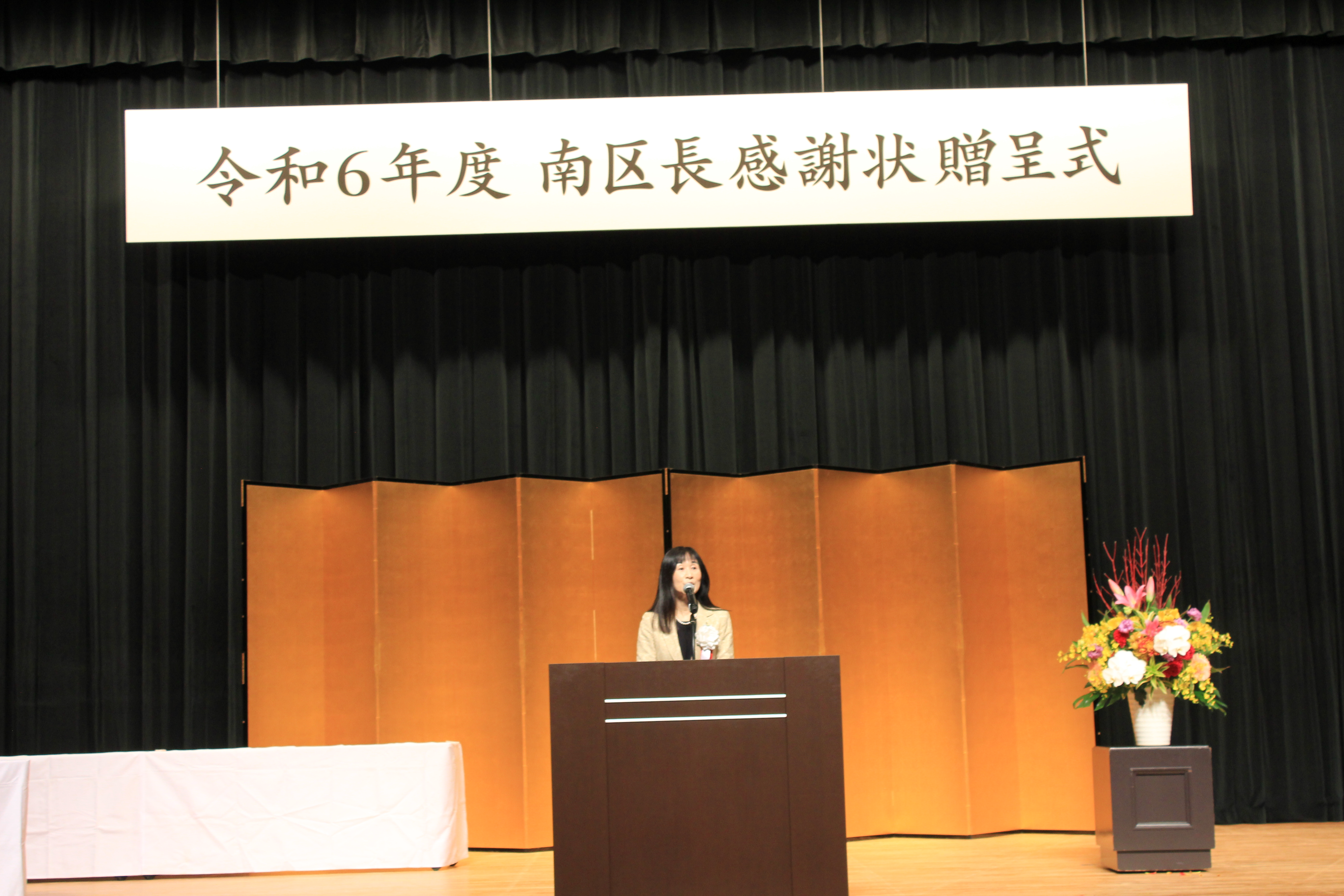 令和6年12月1日(日曜日)南市民センターの文化ホールで贈呈式が行われ、内藤南区長から、お一人おひとりに感謝状が贈呈されました。