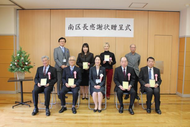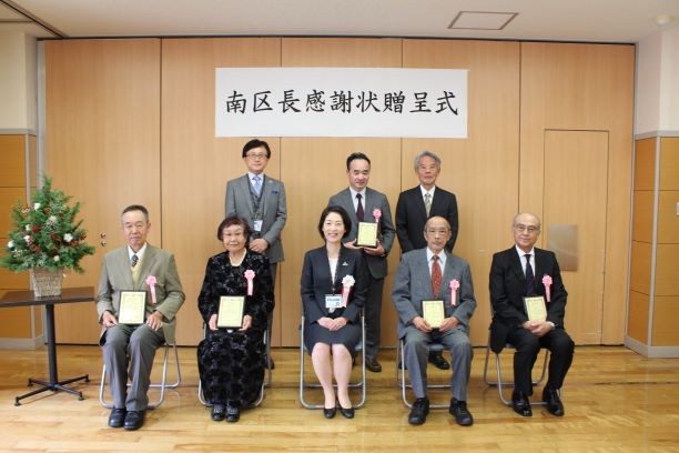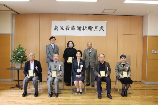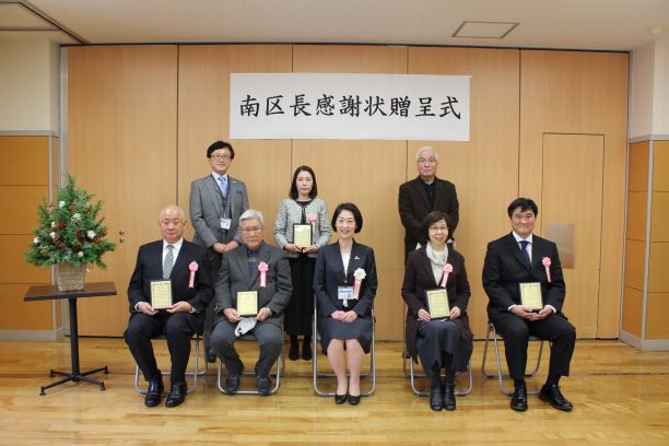 南区において、校区自治活動や青少年健全育成、交通安全推進、スポーツ振興、地域福祉など、自主的かつ積極的に参加または奨励することにより、地域コミュニティづくりに貢献されている方々に対して感謝状を贈呈する、「南区長感謝状贈呈式」を開催しました。