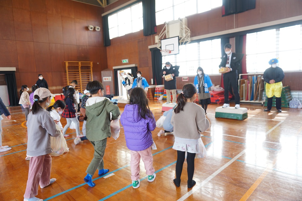 3年ぶりの豆まき大会は、長丘小学校の体育館で行われ、子どもからお年寄りまでたくさんの人が参加しました。コロナウイルス感染症対策のため、時間帯を2つに分け、その中でも6つのグループに分けて豆まきを行いました。