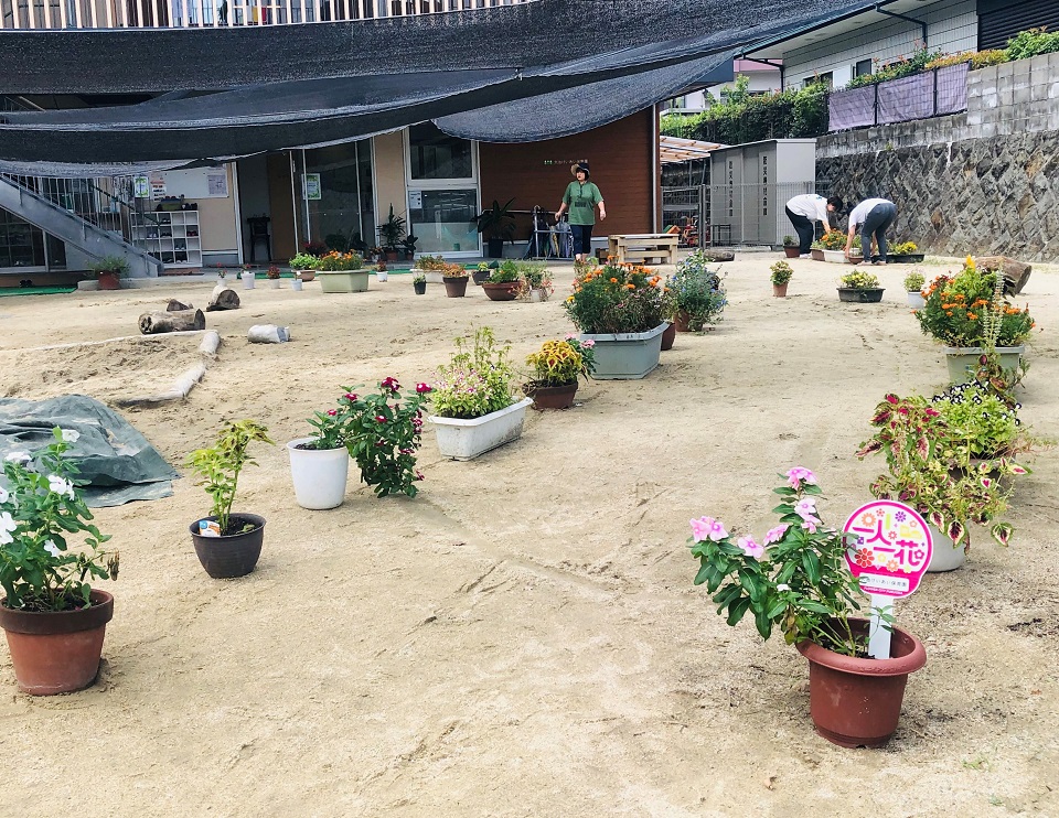 保育園の子どもたちと毎日水をやったり、ダンゴムシやイモムシを見つけたりしながら、小さなジャングルで楽しく遊んでいます。咲いた花に優しくしてくれる子もいれば、きれいな花から次々と摘みたがる子もいます。個々の興味に寄り添いながら、制限・禁止をせずに自然体で植物に触れることをすすめています。