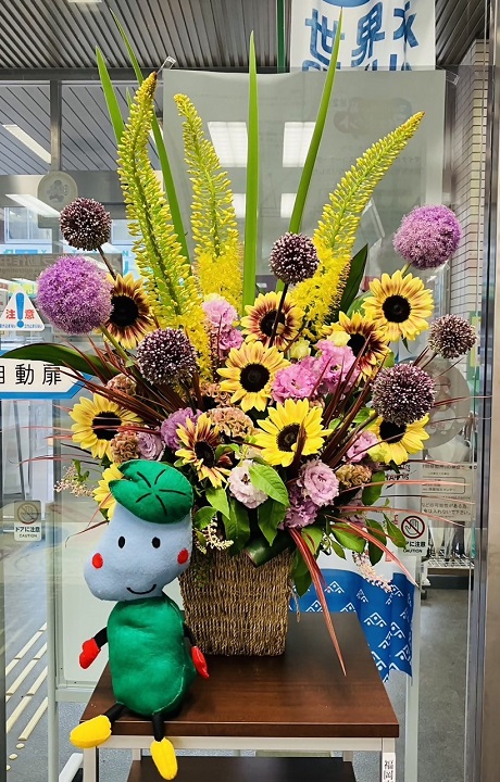 7月の世界水泳大会を花で盛り上げるために“世界水泳おもてなし特製ピック”を、南区役所総務課で配布しています。