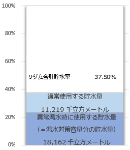 | ダム名 | 利水容量 | 現在利水量 | 貯水率 | 昨日対比 増減 |