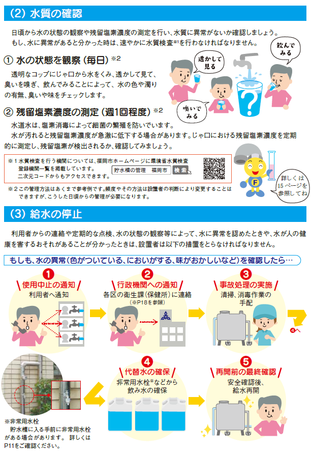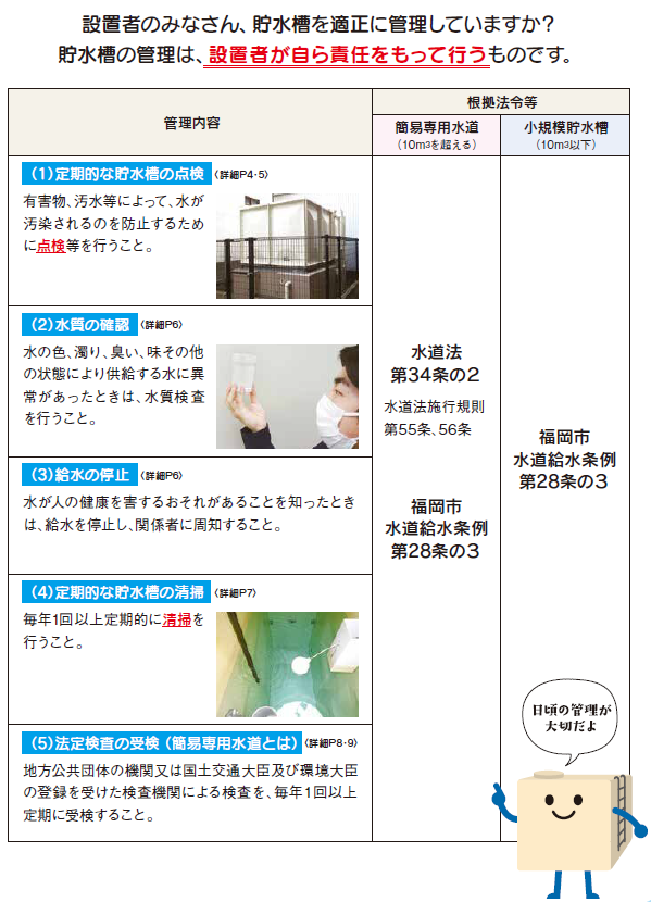 また、貯水槽の有効容量が10㎥(立方メートル)以下の小規模貯水槽水道は、福岡市水道給水条例に、簡易専用水道に準じて適正管理に努めていただくよう定めています。