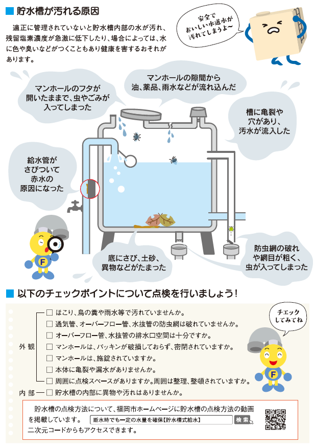 ▼貯水槽の定期的な清掃や検査が必要