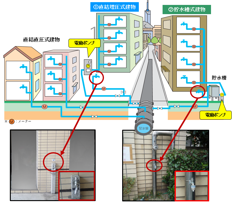 マンションなどの中高層建物の給水は、「直結増圧式」及び「貯水槽式」の二つの方法があります。