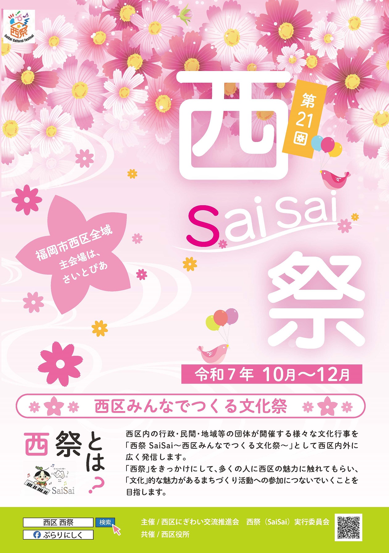 10月中旬から12月中旬までの約2ヶ月間、西区内の行政・民間・地域等の団体が開催する様々な文化行事を「西祭(SaiSai)」として開催しています。西祭(SaiSai)は今回で21回目を迎え、10月11日(土曜日)のオープニングイベントをはじめ、市民美術展、青少年作品コンクール展、コーラスフェスティバル、青少年文化祭、ファミリーコンサートなど、今年度も盛りだくさんの内容で開催します。