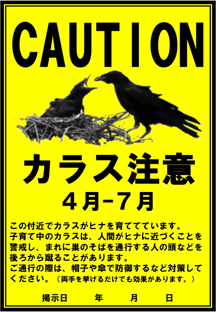 子育て中のカラスによる被害を防止するための注意事項をまとめた啓発チラシ、ポスターを作成しました。