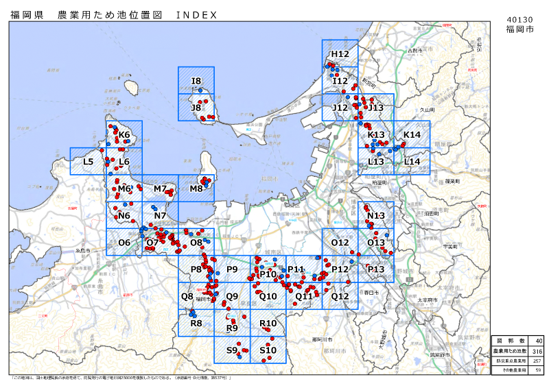 ため池マップとは、福岡県が作成した農業用ため池の位置を示す地図で、防災重点農業用ため池を赤丸で、それ以外の農業用ため池を青丸で表示しています。