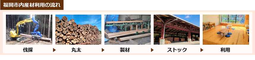 福岡市では、市内で生育・伐採された木材(福岡市内産材)の利用を促進し、「伐(き)って、使って、植える」森林のサイクルを回すことで、森林の持つこれらの機能をさらに高め、快適で豊かな市民生活が持続できる環境を次の世代に残していく取組みを推進しています。