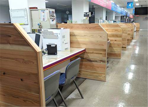 窓口カウンターには、区の脇山産木材などを使用しています。また、待合スペースでも木のぬくもりが感じられるよう、柱の周りにも木材を取り入れたデザインを施しました。