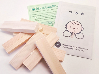 赤ちゃんのいる世帯を対象に、民生委員が自宅に訪問し、地域・子育て情報を提供するとともに、市内産のヒノキのつみきをお祝いの品として配布しています(※訪問を希望する世帯のみ)。