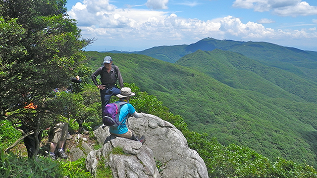 一部岩場があるが起伏の少ない尾根沿いを歩く。金山付近の紅葉は美しく,四季折々の植物の変化を観察できる。坊主ケ滝ルートは急坂が続くルートである。