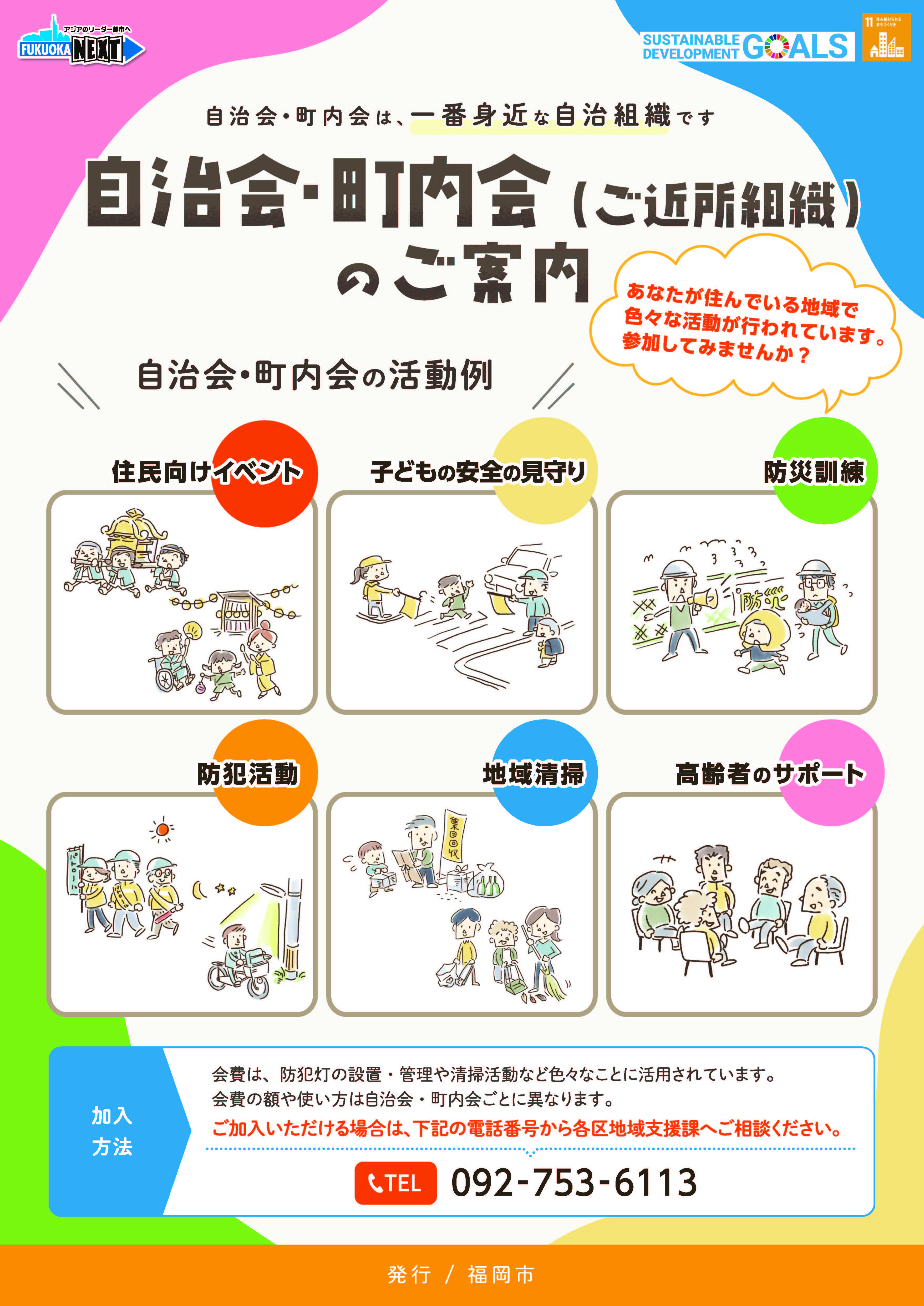 自治組織の基礎となる自治会・町内会の活動を広くお知らせし、地域活動への参加や自治会・町内会加入の呼びかけに活用していただくことを目的として、福岡市自治協議会等7区会長会監修のもと加入促進チラシを作成しました。 転入者の方等へ配布をするなど、自治会・町内会への加入促進活動にご活用ください。