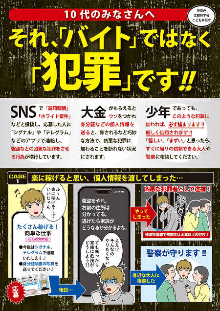 また、募集情報に「受け子」「出し子」「闇バイト」等の隠語が使用されていたり、匿名性の高いアプリケーションでの連絡が求められたりする場合は犯罪に関わる危険性が大です。