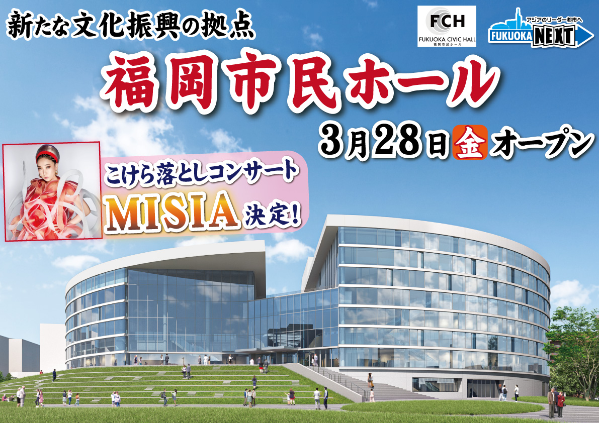 いよいよ、福岡市民ホールのオープン、3月28日に決定いたしました。大中小のホールがあるんですが、こけら落としは、福岡にゆかりのあるMISIAさんに決定をいたしました。【フリップ (438kbyte)】