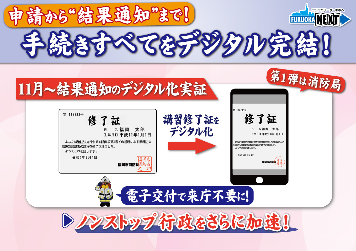 今回ですね、デジタル完結の仕組みの第1弾としては、消防局の講習のオンライン化に合わせて、電子署名を活用した修了証のデジタル化というものを11月から始めるということでございます。
