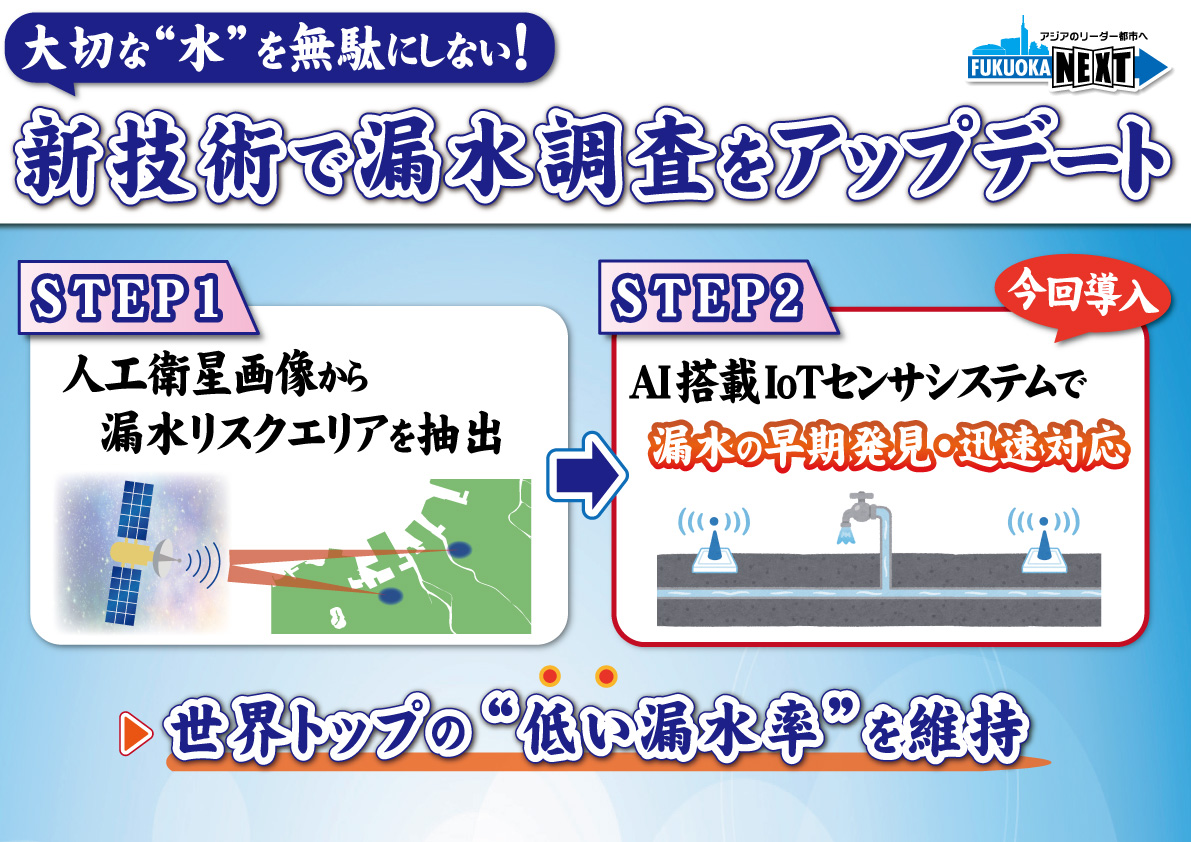 では、続いてに行きます。続いて、福岡市では大切なお水、この漏水調査をですね、新しい技術を使ってアップデートします。【フリップ (386kbyte)】これによって早く漏水を発見して、直すことができるようになるわけです。