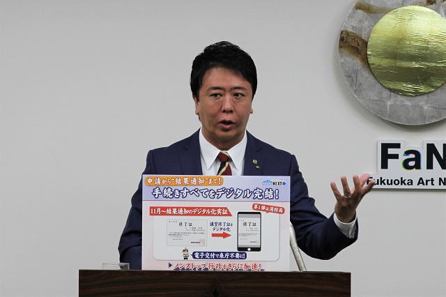 はい。福岡市では、オンライン手続きに続いてですね、今度は行政手続き、これをデジタル完結というところまで行く、新しい取り組みをスタートいたします。【フリップ (329kbyte)】