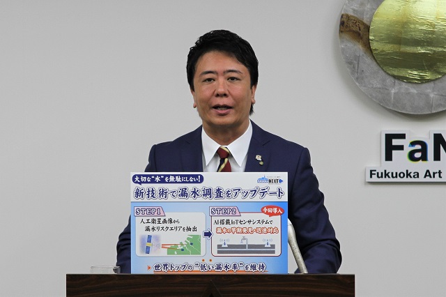 こうした取り組みをすることによってですね、やっぱり福岡市って覚えていらっしゃる方も多いと思うんですけれども、かつて渇水でですね、断水時間が設定されるということもあったわけですね。そんな中で、今なお人口は増え続けている中で、水を使いたいという方も増えているわけで、やっぱり水を大切にしようということは、これは福岡市にとって非常に大事なことですし、今でも、お水3杯に1杯は筑後川からいただいているということもありますので、そういったことで、これまでも水を大切にしてきていて、漏水率は世界の都市で一番低いまちになっていますが、こうした新しい技術を使いながらですね、さらにお水を大切に、漏水対応も早急にしていければと考えております。
