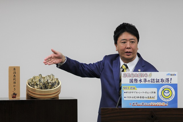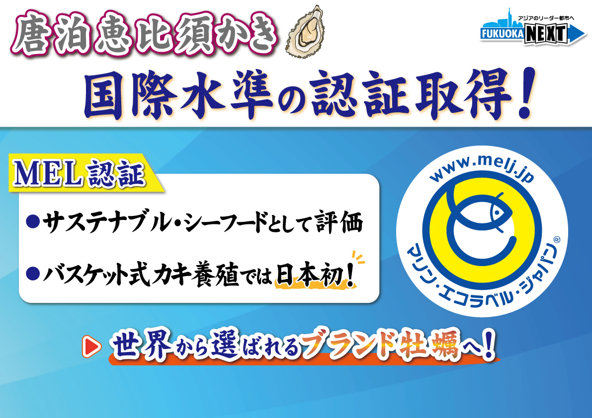 という中で、いかに早くこのMEL認証を取って、そして、もう今、言ってみれば、ちょっと分かりやすく、あえて雑に言いますけど、意識の高いホテルだとか、そういったところは、もしくはレストランというものは、そういったそのストーリーっていうのが売りになるわけですよね。これは環境に配慮されたものですよっていうものを出していますっていうところが、一つの売りになって強みになる中で、福岡市としては、うちの恵比須かきというのは、唐泊の恵比須かきというのは、本当に生で食べられて、しかもリッツのような、ああいう相当なハードルが高い基準を乗り越えて出せる一級品ですから、こういったものにさらに、こういうストーリーをしっかりつけて、これは海を汚さないだとかいうこともそうですけれども、働く環境も含めて、非常にチェックされる項目が多いものですので、こういうものをつくることによって、今現在、シンガポールと香港には既に一流ホテルに入れていただいているんで、それ以外のホテルにも展開をしていくというような形で販路を広げていき、特にいいところに使ってもらうことによってですね、これはスペシャル品としてのやっぱり価値をより高めていければと、行政としても思っています。